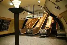 The sub-surface areas are tiled in biscuit coloured tiles lined with yellow friezes. The booking hall is 12 feet (3.7 metres) below street level.[7] In common with Manor House and Wood Green, the station tunnels have a diameter of 23 feet (7 metres) and were designed for the greater volume of traffic expected. Bounds Green and Southgate have only 21-foot (6.4 metres) diameter platform tunnels. The construction of "suicide pits" between the rails was also innovative. These were built in connection with a system of passageways under the platforms to give access to the track.