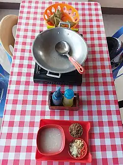 The ingredients are cooked in a wok (kawa) and simmered until the mixture becomes thick and produces bubbles. The dish is served with pusô (hanging rice) which the diners would dip in the prepared tuslob buwa.[4] It is traditionally prepared as a communal food; the street food vendors (pungko-pungko) would cook the tuslob buwa in one wok where several people could share and the diners would pay by the pusô.[5][1]