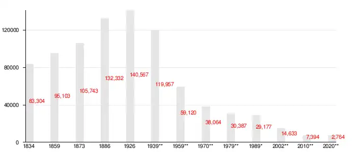 Tver Karelians are a people who inhabit regions of Tver, Saint Petersburg, and Moscow. Their dialect is remarkable in that it does not borrow from other Balto-Finnic languages due to centuries of geographical isolation. Although the number of Tver Karelian people was about 14,633 in 2002, very few (about 25 in one census) named the dialect as their primary language. The number of Tver Karelians was 7,394 in 2010[2] and 2,764 in 2020.[1]