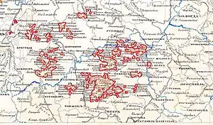 Fragment of the Ethnographic map of European Russia by Peter von Köppen, 1851. Areas of settlement of the Karelians are highlighted (No. 14).