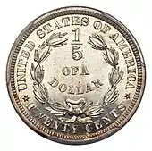 The American twenty-cent piece is a coin struck from 1875 to 1878, but only for collectors in the final two years. Proposed by Nevada Senator John P. Jones, it proved a failure due to confusion with the quarter, to which it was close in both size and value.