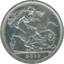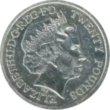 The British twenty pound (£20) coin is a commemorative denomination of sterling coinage, first issued by the Royal Mint in 2013.[1] It is minted in .999 fine silver.[2] Twenty pound coins are legal tender[3] but are intended as souvenirs and are almost never seen in general circulation.