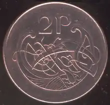 The two pence (2p) (Irish: dhá phingin) coin was the third smallest denomination of the Irish pound, being worth 150 of a pound. It was first issued on Decimal Day, 15 February 1971. The coin was minted until 2000. It was the third of three new designs introduced all in bronze, the others being the halfpenny and penny. All featured ornamental birds on the reverse.
