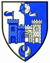 Per pale Argent and Azure, a castle of two towers flagged each with postern and window, and portcullis raised, all counterchanged, and in chief a rose also counterchanged, and in base a crescent likewise counterchanged. [19]