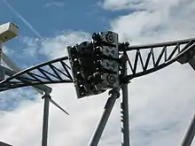 Typhoon is a steel roller coaster at the Bobbejaanland amusement park in Lichtaart, Belgium. Typhoon is a Gerstlauer Euro-Fighter model roller coaster, and the second installation of this model line.[1] At 97 degrees, the coaster's first drop is steeper-than-vertical and it has the steepest drop of any roller coaster in Belgium.[2]