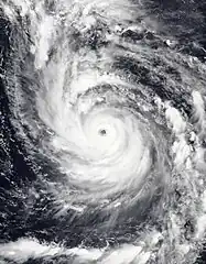Khanun entered the Philippine Area of Responsibility around 03:00 UTC (11:00 PHT) on July 29, and was named Falcon by the Philippine Atmospheric, Geophysical, and Astronomical Services Administration (PAGASA).[11] Tracking northward due to a nearby mid-level subtropical high-pressure area, Khanun intensified into a severe tropical storm.[12] A central dense overcast (CDO) and a ragged eye developed, indicating that Khanun intensified into a typhoon.[13][14] Over 24 hours, its maximum sustained wind speeds grew by 130 km/h (80 mph) and eventually reached a peak of 220 km/h (140 mph), equivalent to Category 4 status on the Saffir–Simpson scale.[15][16] The JMA simultaneously assessed Khanun to have winds of 175 km/h (110 mph), and a minimum pressure of 930 hPa (27.46 inHg).[17] Khanun left the Philippine Area of Responsibility at around 03:00 PHT (19:00 UTC) on August 1.[18] Khanun weakened slightly as it moved move closer to the Ryukyu Islands, battering them with heavy rain and strong winds.[19]