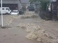 During the storm's passage, there were 61 daily rainfall records broken by Nabi's precipitation across Japan.[2] The rains from Nabi caused significant slope failures and large accumulations of driftwood. The amount of sediment displaced by the rains was estimated at 4,456 m3/km2, over four times the yearly average. A total of 630 m3 (22,000 cu ft) of driftwood was recorded.[57] However, the rainfall also helped to end water restrictions in Kagawa and Tokushima prefectures.[58][59] In addition to the heavy rainfall, Nabi produced gusty winds on the Japan mainland, peaking at 115 km/h (71 mph) in Muroto. A station on Tobishima in the Sea of Japan recorded a gust of 119 km/h (74 mph).[53] The typhoon spawned a F1 tornado in Miyazaki, which damaged several buildings.[60] In Wajima, Ishikawa, Nabi produced a Foehn wind, causing temperatures to rise quickly.[61]
