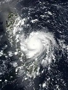 Vongfong's cloud tops were rapidly cooling and consolidating upon its upgrade to a tropical storm, indicative of a strengthening cyclone.[15] The storm also began to develop anticyclonic outflow and curved rainbands.[16] A well-defined eye soon emerged on microwave satellite imagery as the storm's structure became further organized,[17] surrounded by hot towers with the storm tracking nearly due west in response to a subtropical ridge centered over the Northern Mariana Islands.[18] At 06:00 UTC on May 13, the JMA upgraded Vongfong to severe tropical storm status,[19] followed by an upgrade to typhoon status six hours later.[20] The eye became increasingly pronounced and contracted to less than 10 km (6.2 mi) in diameter as the storm's evolution became suggestive of rapid intensification.[21][22][23] The JTWC assessed 1-minute sustained winds of 195 km/h (121 mph) at 21:00 UTC on May 13 shortly before the onset of an eyewall replacement cycle;[24] nine hours later, the JMA analyzed Vongfong to have attained 10-minute sustained winds of 155 km/h (96 mph) and a barometric pressure of 965 hPa (mbar; 28.50 inHg).[25] Vongfong made landfall with this intensity over San Policarpo, Eastern Samar, at 04:15 UTC on May 14.[26][27] The storm's structure degraded due to land interaction as it traversed Samar, causing Vongfong's eye to dissipate.[28][29] Vongfong made six additional landfalls as it traversed the remainder of the Visayas into Luzon: Dalupiri Island; Capul Island; Ticao Island; Burias Island; San Andres, Quezon; and Real, Quezon.[30] The prolonged interaction with land caused Vongfong to weaken, though the storm maintained a compact circulation amid otherwise favorable atmospheric conditions.[31][32] On May 15, Vongfong weakened below typhoon status and began to track towards the northwest around the periphery of a subtropical ridge.[33][34] It weakened further to a tropical storm by 18:00 UTC that day.[35] The center moved off Luzon and became dislocated from atmospheric convection over the Luzon Strait the following day.[36] At 09:00 UTC on May 16, the JTWC issued its final warning on the system.[37] Nine hours later, the JMA downgraded Vongfong to tropical depression status.[38] The PAGASA declared Vongfong to have dissipated on May 17 while over the Bashi Channel.[39]