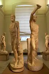 A sculptural pairing of Harmodius and Aristogeiton, who became known as the tyrannicides after they killed Hipparchus and were the preeminent symbol of Athenian democracy