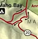 The route begins at Highway 10 in the center of Cruz Bay. Highway 20 runs along the northern shore of St. John, passing through Virgin Islands National Park. The road serves many popular beaches, including Cinnamon Bay and Trunk Bay. The highway travels along the coast for most of its length, and has several turnouts for scenic overlooks. The roadway begins to bend into the center of the island, in the process passing several small houses and buildings. Highway 20 has one auxiliary route along its length, Highway 206.[1]