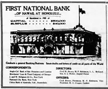 - ↑ "First American Bank". The Hawaiian Star. 18 April 1899. p. 1. Retrieved 1 March 2016 – via Newspapers.com.