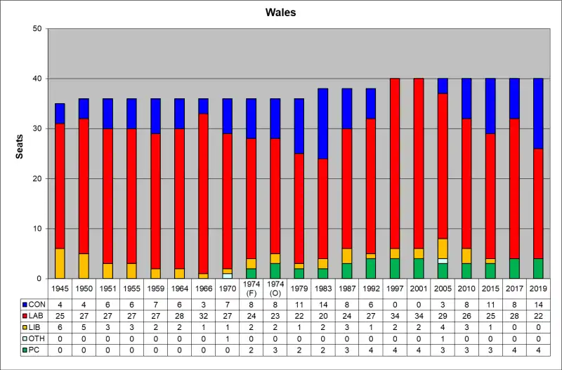 Wales is currently divided into forty constituencies of the Parliament of the United Kingdom, which elect Members of Parliament to the House of Commons. After the general election of December 2019, 22 of the Welsh constituencies are represented by Labour MPs, 14 by Conservative MPs, and 4 by Plaid Cymru MPs.[1]