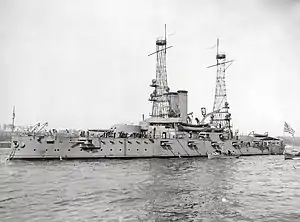 Alabama was laid down at the William Cramp & Sons shipyard in Philadelphia on 2 December 1896 and was launched on 18 May 1898. She was commissioned on 16 October 1900, the first member of her class to enter service.[2] The ship's first commander was Captain Willard H. Brownson. Alabama was assigned to the North Atlantic Squadron, though she remained at Philadelphia until 13 December, when she made a visit to New York, where she remained through January 1901. On the 27th, Alabama steamed south for the Gulf of Mexico, where she joined the rest of the North Atlantic Squadron for training exercises off Pensacola, Florida.[3] In August 1901, while the North Atlantic Squadron conducted target practice off of Nantucket Island, Alabama experienced an outbreak of mumps and was placed in quarantine, unable to participate.[4]