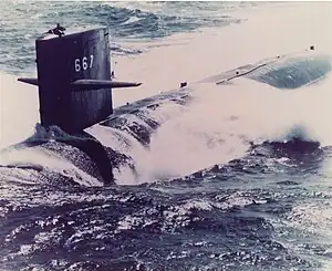 ![]() USS Bergall (SSN-667), possibly while on sea trials off New England in 1968-1969. | |