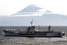 USS Blue Ridge (LCC-19) is the lead ship of the two Blue Ridge-class amphibious command ships of the United States Navy, and is the flagship of the Seventh Fleet. Her primary role is to provide command, control, communications, computers, and intelligence (C4I) support to the commander and staff of the United States Seventh Fleet. She is currently forward-deployed to U.S. Navy Fleet Activities, Yokosuka in Japan, and is the third Navy ship named after the Blue Ridge Mountains, a range of mountains in the Appalachian Mountains of the eastern United States. Blue Ridge is the oldest deployed warship of the U.S. Navy, following the decommissioning of USS Denver.[3] Blue Ridge, as the U.S. Navy's active commissioned ship having the longest total period as active, flies the First Navy Jack instead of the jack of the United States.[4] Blue Ridge is expected to remain in service until 2039.[5][6][7]