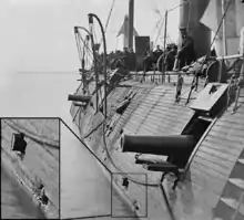 Galena was tied to the port side of the larger sloop Oneida and the pair were the last ships in the port column when the battle began on the morning of 5 August.[25] While passing the fort, Oneida had her starboard boiler disabled by a shell hit and her crew was attempting to reroute her steam to both engines when she was engaged by Tennessee at a range of 200 yards (180 m). The ironclad only managed to fire three shots that did little damage. Galena was struck six times while passing the fort with little damage, although her rigging was badly cut up. Two crewmen were wounded and another died of his wounds.[26] Four of Galena's sailors were awarded the Medal of Honor for their actions during the battle: Seaman William Gardner, Quartermaster Thomas Jordan, Quartermaster Edward S. Martin, and Coxswain Edward B. Young.[18][19]