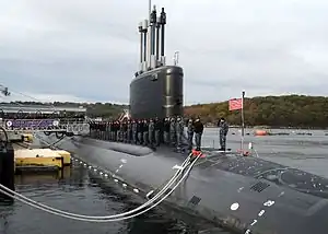 USS Illinois (SSN-786) is a Virginia-class nuclear-powered attack submarine in the United States Navy. Named for the State of Illinois, she is the third vessel with the name, the previous two being battleships BB-7 and BB-65, which was never completed. She was built by the Electric Boat division of General Dynamics, the third of their Block III variants which feature a revised bow and technology from the converted sub-class of Ohio guided missile submarines (SSGN).[10] The contract for the build was awarded on 22 December 2008 to Huntington Ingalls Industries in partnership with Electric Boat, and construction commenced with the keel laying ceremony on 2 June 2014, at their yard in Groton, Connecticut. First Lady Michelle Obama served as the ship's sponsor,[11] and christened the boat on 10 October 2015.[3] Illinois was launched on 8 August 2015[1] and completed sea trials on 2 August 2016.[12] She was delivered to the Navy on 27 August 2016 and commissioned in a ceremony at Naval Submarine Base New London on 29 October 2016.[4][5][13] Then-First Lady Michelle Obama, as the sponsor, attended the ceremony and is considered to be an honorary member of the crew due to her support of military families and her involvement with the Illinois crew and their families.[14]