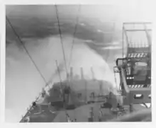 On 1 August, BatDiv 8 was detached to form Support Unit 38.1.2; the ships continued their attacks on coastal cities in company with TF 37. One of Indiana's Kingfishers accidentally crashed in the sea on 7 August, killing its crew. The ships of BatDiv 8 conducted a second attack on Kamaishi on 9 August, with Indiana firing a total of 270 shells between 12:46 and 14:45. Poor visibility again hampered the observers, though this proved to be the ship's last offensive operation. Japan agreed to surrender unconditionally on 15 August while Indiana was en route to the coast to support another wave of carrier strikes. Instead of munitions, food and medical supplies were loaded onto the carriers' aircraft to be dropped on prisoner of war (POW) camps. Indiana contributed a landing party to be sent ashore on 30 August, which was part of the initial occupation forces.[17]
