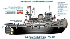 Iona (YT/YTB/YTM-220), a wooden tugboat originally classified YT-220, was launched by Greenport Basin and Construction Company, Greenport, New York, 26 August 1944; sponsored by Mrs. Martina E. Swanson; and placed in service 2 February 1945. She was the second United States Navy ship of that name.
