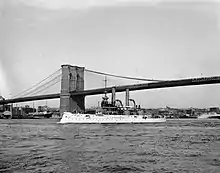 Iowa left Cuban waters after Spain surrendered in August, arriving in New York on 20 August. Captain Silas Terry took command of the ship on 24 September and on 12 October, she departed for the West Coast of the United States, where she was to join the Pacific Squadron. The next year passed uneventfully and Iowa put into the Puget Sound Navy Yard for an overhaul that began on 11 June 1899. She took part in training exercises off San Diego, California from 20 December to 15 January 1900. On the first day of the exercises, Iowa lost one of her Howell torpedoes after the practice warhead likely detached after it was launched. In March 2012, a pair of dolphins that were part of the Navy's Marine Mammal Program recovered the torpedo, which was missing the practice warhead;[12] the section recovered was later transferred to the Underwater Archaeology Branch for preservation. The torpedo is one of three Howell torpedoes known to exist.[13] During the period in San Diego, she received a pair of 3-inch field guns and four M1895 Colt-Brownings that were chambered in .30-40 Krag for use by landing parties ashore. After the training exercises, Iowa underwent a refit, after which she resumed her peacetime routine of training exercises, shooting practice, and cruises in the eastern Pacific. Captain Philip H. Cooper took command of the ship on 9 June, serving as her commander until 1 April 1901.[12] On 8 September, the sailing ship Mary Flint collided with her while she was at anchor in San Francisco Bay and then collided with a barque and sank.[14]