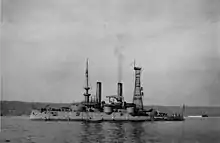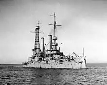 Six 4 in (100 mm)/40 cal quick-firing guns rounded out the secondary battery; these were intended to use their high rate of fire, coupled with high-explosive shells to damage unarmored parts of enemy warships. Four of these were placed in individual casemates in the forecastle deck, two in sponsons in the bow and the other two located amidships. The remaining two guns were in open shielded mounts on the aft superstructure, superfiring over the rear main battery turret.[8] They fired a 33 lb (15 kg) high-explosive shell at a muzzle velocity of 2,000 ft/s (610 m/s).[11] For defense against torpedo boats, the ship carried a battery of twenty 57 mm (2.2 in) 6-pounder Hotchkiss guns and four 37 mm (1.5 in) 1-pounder guns These guns were dispersed around the ship in a variety of individual mounts, including in the fighting top of the military mast, the superstructure, and in sponsons in the hull. She also carried four M1895 Colt–Browning machine guns chambered in 6mm Lee Navy.[7]