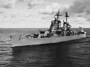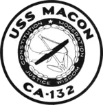 USS Macon (CA-132), a Baltimore-class heavy cruiser of the United States Navy, was laid down on 14 June 1943 by the New York Shipbuilding Corp., Camden, New Jersey; launched on 15 October 1944; sponsored by Mrs. Charles F. Bowden, wife of the mayor of Macon, Georgia; and commissioned on 26 August 1945 at Philadelphia, Captain Edward Everett Pare in command.