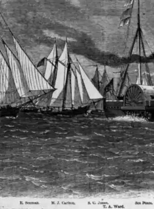 According to naval historian Paul Silverstone, the schooner Maria J. Carlton had been built in Philadelphia, Pennsylvania, before the American Civil War and launched at an unknown date. [1] However, naval historian Craig W. Gaines states she was built in 1859 at Saybrook, Connecticut,[2] while an 1862 account in the Baltimore Sun states she was built in 1856 in East Haddam, Connecticut, from white oak and chestnut wood.[3] She was 98 feet (30 m) long, had a beam of 27 feet (8.2 m), and a draft of 7 feet 8 inches (2.34 m),[2] with a tonnage of 178 tons.[4] Maria J. Carlton was used as part of the packet trade between New York City and Boston, Massachusetts.[3] On October 15, 1861, the United States Navy purchased Maria J. Carlton from a Mr. Warner at Middletown, Connecticut; the previous name remained in use after the Navy took over. After the purchase, Maria J. Carlton was sent to the New York Navy Yard in Brooklyn to be converted for military use.[4] During her Navy service, she had a crew of 28 and was armed with a 13-inch (33 cm) mortar and two 12-pounder howitzers.[2] She was then commissioned on January 29, 1862; her commander was Acting Master Charles E. Jack.[4]