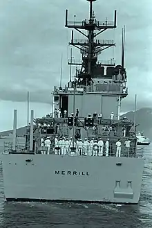 USS Merrill (DD-976), named for Rear Admiral Aaron Stanton Merrill USN (18901961), was a Spruance-class destroyer that entered service with the United States Navy in 1978. Merrill served as the US Navy's test platform for the Tomahawk cruise missile. In the 1980s, the destroyer took part in Operation Earnest Will in the Persian Gulf during heightened tensions with Iran. The destroyer was decommissioned in 1998. The vessel was used as a target ship in 2003 and sunk off Hawaii in 2003.