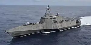 In 2002, the United States Navy initiated a program to develop the first of a fleet of littoral combat ships.[5] The Navy initially ordered two trimaran hulled ships from General Dynamics, which became known as the Independence-class littoral combat ship after the first ship of the class, USS Independence.[5] Even-numbered U.S. Navy littoral combat ships are built using the Independence-class trimaran design, while odd-numbered ships are based on a competing design, the conventional monohull Freedom-class littoral combat ship.[5] The initial order of littoral combat ships involved a total of four ships, including two of the Independence-class design.[5] On 29 December 2010, the Navy announced that it was awarding Austal USA a contract to build ten additional Independence-class littoral combat ships.[6][7]
