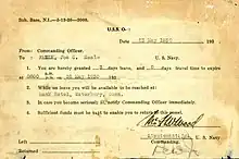 Three-day pass from USS O-9 dated 26 May 1930