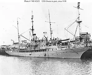 The U.S. Navy acquired her from her owner Senator Gerry under free lease for service as a patrol vessel commissioned on 15 June 1917 as USS Owera (SP-167). The Navy formally leased her from Senator Gerry on 18 June 1917.[1][3] The converted yacht's Naval crew was thirty-four, two of them officers.[1] Armament is shown in Navy documents of the time as being two 3 inch, 50 caliber guns,[1] a heavier and more capable gun than those in later descriptions of the guns as 6-pounders.[3] All references show two machine guns.[1][3]