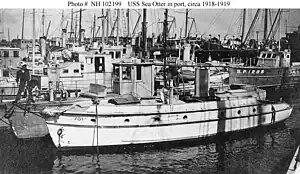![]() USS Sea Otter (SP-781), probably while awaiting disposal in 1919. She is in port with many other section patrol craft, including USS Patrol No. 10 (SP-85) (second boat inboard of Sea Otter) and USS Daiquiri (SP-1285) (in right background). | |