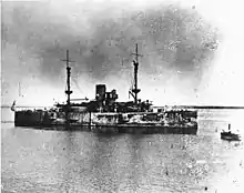 Texas was decommissioned for a lengthy refit on 3 November 1900 at the Norfolk Navy Yard but was commissioned again on 3 November 1902.[23] During this refit, her funnel and topmasts were raised. Furthermore, the protection for her 12 in (300 mm) ammunition hoists was doubled and her broadside torpedo tubes were removed.[30] On one voyage to New Orleans in February 1904, Texas could only make 13.9 knots (25.7 km/h; 16.0 mph) under forced draft.[2] During 1904 her armament was upgraded when she exchanged her four 6 in (150 mm)/30 cal guns for more powerful 35-caliber weapons and two one-pounder guns were landed. She served as flagship for the Coast Squadron until 1905, and remained assigned to it after its commander shifted his flag.[24]