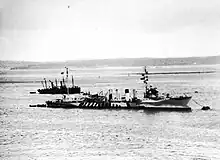 Wadsworth made her fourth depth charge attack on a U-boat on 29 July. At about 17:25, she dropped several charges in what appeared to be the wake of a submarine proceeding submerged. The conjecture that a U-boat was damaged was supported by the appearance of a large amount of heavy oil on the surface following the attack. Just before 23:00, the warship attacked another supposed submarine wake. It was too dark to evaluate the results; but, not long thereafter, Trippe struck a submerged metallic object which caused her to list 10° temporarily. Later, Wadsworth's wireless operator intercepted messages sent by a German submarine over a period of about half an hour which suggested that Wadsworth may have damaged a submarine, although as with the depth-charge attack of 21 June, no definite proof was forthcoming. Early in August, the destroyer concluded her summer of peak activity by escorting the first United States merchant convoy on the last leg of its voyage to Europe. During the mission, on the 16th, the destroyer dropped a barrage on what was thought to be a submarine.[1]