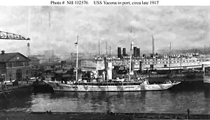 The auxiliary patrol vessel USS Yacona (SP-617) was built in 1898 in Scotland as a civilian steam yacht of the same name.[lower-alpha 1] Later, she was renamed Amélia as a survey yacht of the King of Portugal, before reverting to Yacona in 1901. She was acquired by the U.S. Navy in September 1917 and served until 1919 as a patrol vessel in the western Atlantic. In 1921 she was transferred to the Philippines as the governmental yacht Apo, serving until 1932.