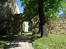 A Baroque castle was built on the site of an old Gothic castle that was abandoned in the 17th century. Uherský Brod Castle was designed by D. Martinelli and was originally intended to be a large complex, however, after 1705, the construction did not continue and only a part was created. Today the castle houses the Museum of J. A. Comenius. Fragments of the town walls are preserved, especially in the neighbourhood of the castle. Three of four gates were demolished in 1874. The only preserved gate now forms the entrance to the Museum of J. A. Comenius.[9]