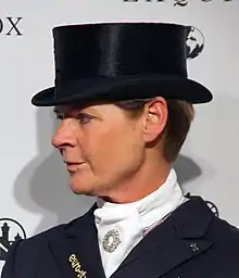 The 2001 and 2003 European Championships brought four gold medals in team and individual competition, while the 2001 and 2002 Dressage World Cup competitions brought two additional golds. The 2002 World Equestrian Games brought a repeat of 1998, with team gold and individual bronze medals. In 2003, however, Salzgeber became mired in doping charges after Rusty tested positive for testosterone propionate at the 2003 World Cup finals, losing what would have been a third successive gold. Rusty's veterinarian claimed the drug was given to him to treat a hormonal imbalance, but the pair was banned from competition for two months by the German Equestrian Federation. An exception was made for the 2004 German Dressage Championships, which allowed them to qualify for the 2004 Olympic Games.[3] She was not allowed to compete in qualifying events for the 2004 World Cup, and she did not ride in the event.[5] At the 2004 Summer Olympics, she improved her individual performance to win a silver medal, and rode with the German team to a second successive gold in the team competition.[1] Rusty was retired soon after the 2004 Olympics, and was euthanized in 2013 at the age of 25.[3] Months before his death, it was announced that Rusty had been cloned, resulting in two young stallions, nicknamed "Rusty Clone 1" and "Rusty Clone 2".[4]