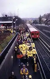 During the 1980s, the city decided to connect the four suburban lines west of the city center with the Oslo Metro. The Sognsvann Line was selected as the first line to be upgraded, so the two systems would become compatible. The line was upgraded to metro standard by replacing the overhead wire with a third-rail power supply and installing automatic train protection.[4] From 4 April 1993 trains along the Sognsvann Line were connected to the eastern part of the metro, initially connected with the Østensjø Line.[5] From 20 August 2003 the new Ring Line opened and Line 5 continued through it.[6]