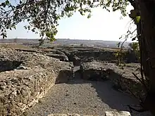The Northern Necropolis (Memoria) is an edifice, located outside the city walls, on top of a cemetery. It was unearthed during the first phase of the excavations in the 1950s.[16] The initial findings were four graves, followed by the discovery of multiple sarcophagi made of marble. Two tombstones were also found, with one of them dedicated to some Aelia Clementilla. The second tombstone, much larger in size, was dedicated to local magistrate Marcus Pontius and his wife Furia Caecilla.[20] Further digging in the same expedition discovered the Necropolis itself. The Necropolis is dated to the 6th century, however, there is evidence to suggest that it predates the city walls, meaning that it was likely constructed in the 4th century. The Necropolis had an apse on its eastern side and a two-columned door between its narthex and its nave. The Necropolis also had a mosaic floor with Latin inscriptions but those were not preserved and have been permanently lost.[16]