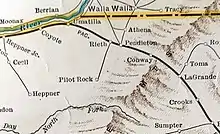 The Umatilla Central Railroad built a 14.21-mile (22.87 km) branch line of railroad in Umatilla County, Oregon, U.S., connecting the main line of the Oregon Railroad and Navigation Company (OR&N) at Rieth to Pilot Rock. The company was incorporated on May 24, 1906, and was operated under lease by the OR&N from opening date, December 16, 1907, until December 23, 1910, when the properties of both were sold to new Union Pacific Railroad (UP) subsidiary Oregon–Washington Railroad and Navigation Company.[1] The line has survived as UP's Pilot Rock Industrial Lead.[2]