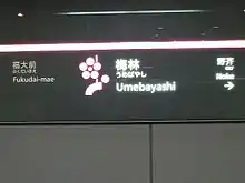 Umebayashi Station (梅林駅) is a subway station on the Fukuoka City Subway Nanakuma Line in Jōnan-ku, Fukuoka in Japan. Its station symbol is a picture of a plum blossom in pink.