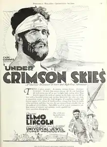 Under Crimson Skies is a 1920 American silent adventure film directed by Rex Ingram and starring Elmo Lincoln, Harry von Meter and Mabel Ballin.[1] There are no known archival holdings of the film, so it is presumably a lost film.[2]