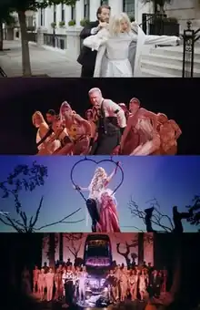 The music video for "Unholy" was released on 30 September 2022.[10] Inspired by A Clockwork Orange and Bob Fosse, it was directed by Floria Sigismondi and choreographed by the French dance collective (La)Horde.[56][57] The video opens on a man, played by Henry Davis, opening a car door for his wife, who exits and is given a coat by the man after she starts shivering. The two part ways as she enters a strange building and looks at a condom-themed invitation to a club called the Body Shop. Her husband enters the club, which is disguised as an auto shop but is actually a sex club and cabaret for which Smith, who wears a leather harness[26] and is accompanied by androgynous burlesque dancers, is the MC. Drag queens Violet Chachki and Gottmik, both of whom were contestants on RuPaul's Drag Race, and pole-dancing strippers also appear at the club, along with gay pornographic star Paddy O'Brian. Petras soon arrives onstage in a heart-shaped ring and dances atop a car. The man is brought onto the stage before his wife arrives at the club to find him laid out in front of a suspended car with the words "liar", "cheat", and "fumier"—the French word for "shit"—spray painted on it. The woman walks down an aisle and gets on stage, taking off her wig and coat to reveal that she was part of the cast all along before taking a bow.[58][59]