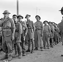 During the Gallipoli campaign New Zealand troops wore a variety of hot-weather khaki drill uniforms with either slouch hats or the Peaked cap of the British Army.[8] Supply difficulties and the harsh nature of terrain and climate during this campaign meant that little emphasis was placed on smartness or uniformity of dress.[9]