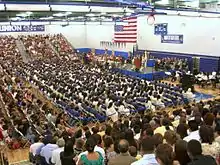 The merger of the two high schools into Union City High took place in July 2008, but due to a delay in the building process, for the subsequent school year classes remained at the predecessor school buildings, now Union City South (Emerson) and Union City North (Union Hill); students retained the same teachers at their respective campuses. The athletic teams however combined in 2008.[1] The Union City High School building opened for students on September 3, 2009,[27] marking the first high school built in Union City in 90 years.[12] The school's inaugural principal was David Wilcomes.[28] A ribbon-cutting ceremony was held on September 25, and attended by Union City Mayor Brian P. Stack, New Jersey Governor Jon Corzine and Senator Bob Menendez.[12][29] A subsequent opening gala was held September 26, and featured appearances from celebrities such as Harry Carson of the New York Giants and actor and Union Hill High School graduate Bobby Cannavale, and a performance by musician Tito Puente Jr.[30] A performance by Cuban singer Cucu Diamantes was cancelled by the city's Board of Education, causing controversy. The Board cancelled the performance in response to threats of protest by anti-Castro activists over Diamantes' performance in a concert in Havana, Cuba days earlier.[31][32]