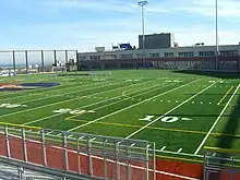 The school's centerpiece is its 3-acre (1.2 ha) athletic field, called the Eagle's Nest, located on the second-floor roof,[54] an idea that inspired from a field that lies on top of a parking garage on the campus of Georgetown University.[55] The field features skyline views of the Empire State Building and Midtown Manhattan. The architecture of the athletic complex, which cost $15 million, was designed to resemble the former Roosevelt Stadium, which previously occupied the site. A number of classrooms on the third and fourth floors overlook the field, which rests on two floors of steel and reinforced concrete. The field's bleachers seat 2,100 spectators. The field's on-campus location eliminates not only the students' prior need to walk or be bussed from school to a separate location to play, but the need for the two prior schools to share the field. Although the merger of the former Union Hill Hillers and Emerson Bulldogs had experienced some difficulties a year prior when the students were still housed at separate high schools (called Union City High School's North and South campuses, respectively), the merge had been ameliorated by the move of the unified student body to the single new school.[4][7][10][25][56][57] The athletic facility has been singled out as one of the most unusual in the United States.[55][56][58][59] It was included in MaxPreps' 2012 list of "10 more high school football stadiums to see before you die".[54] Due to the athletic field's unique location, it deals with unusual logistical challenges, such as balls that land on the streets surrounding the school; space limitations that place the band close to the visitors' sideline, thus making it sometimes difficult to hear; and games that are interrupted by school fire drills.[55]