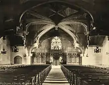 The sanctuary and building was completed in 1906 on land donated by John J. Albright, who built the Albright–Knox Art Gallery in Buffalo, New York completed in 1905. In 1908, Col. Charles Clifton paid the remaining $25,000 of the mortgage on the church building on the condition that the pews would be forever free. The church is designed in a Gothic Revival style with walls and tracery in the arched windows of Indiana limestone, a crenelated turret, and oak doors decorated with wrought-iron fleur-de-lis. The interior of the church is English Country Gothic in style. The sanctuary has seating for 400 and features a great oak hammer beam ceiling soaring from stone corbels about ten feet above the floor.