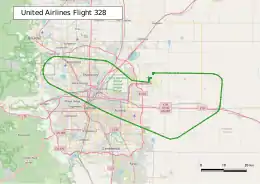 On February 20, 2021, United Airlines Flight 328 (UA328/UAL328), a scheduled U.S. domestic passenger flight from Denver to Honolulu, suffered a contained engine failure[2] four minutes after takeoff from Denver International Airport (DEN).[1][3] Parts departing from the engine cowling of the Boeing 777-222[lower-alpha 1] aircraft resulted in a debris field at least 1 mile (1.6 km) long over suburban residential areas of Broomfield, Colorado.[4][5][6][7] Falling debris was recorded by eyewitnesses using smartphone cameras and a dash cam.[8][9] Debris fell through the roof of a private home[4] and significantly damaged a parked vehicle.[10]