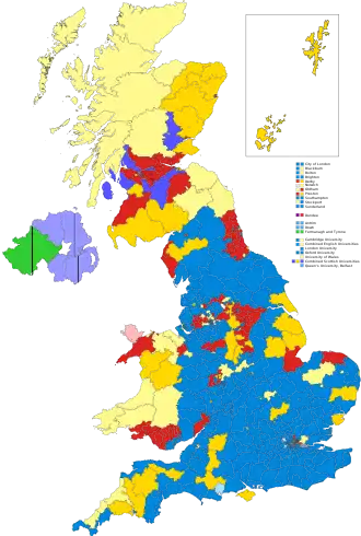 Colours denote the winning party—as shown in § Results
