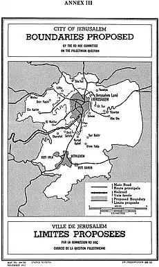 1. To restate, therefore, its intention that Jerusalem should be placed under a permanent international regime, which should envisage appropriate guarantees for the protection of the Holy Places, both within and outside Jerusalem and to confirm specifically the following provisions of General Assembly resolution 181 (II): (1) The City of Jerusalem shall be established as a corpus separatum under a special international regime and shall be administered by the United Nations; (2) The Trusteeship Council shall be designated to discharge the responsibilities of the Administering Authority . . . ; and (3) The City of Jerusalem shall include the present municipality of Jerusalem plus the surrounding villages and towns, the most eastern of which shall be Abu Dis; the most southern, Bethlehem; the most western, Ein Karim (including also the built-up area of Motsa); and the most northern., Shu'fat, as indicated on the attached sketch-map (annex B)(2) ;
